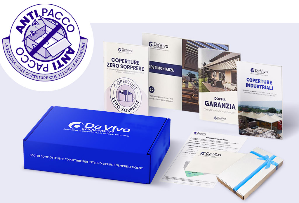 Grazie ai materiali contenuti in questa scatola, conoscerai tutto quello che c’è da sapere per installare una copertura per esterno sicura e sempre efficiente e proteggerti da investimenti sbagliati.