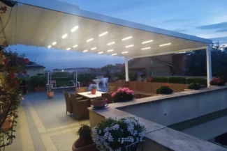Dopo la consulenza ricevuta, Carmen mi ha suggerito una Pergola motorizzata Kalè con led integrati così da allestire tutto con un tavolo e delle sedie.
