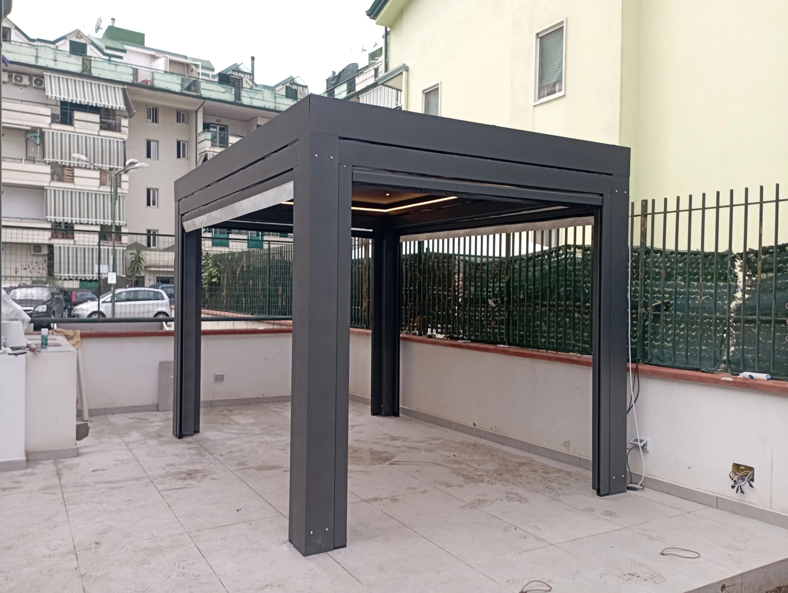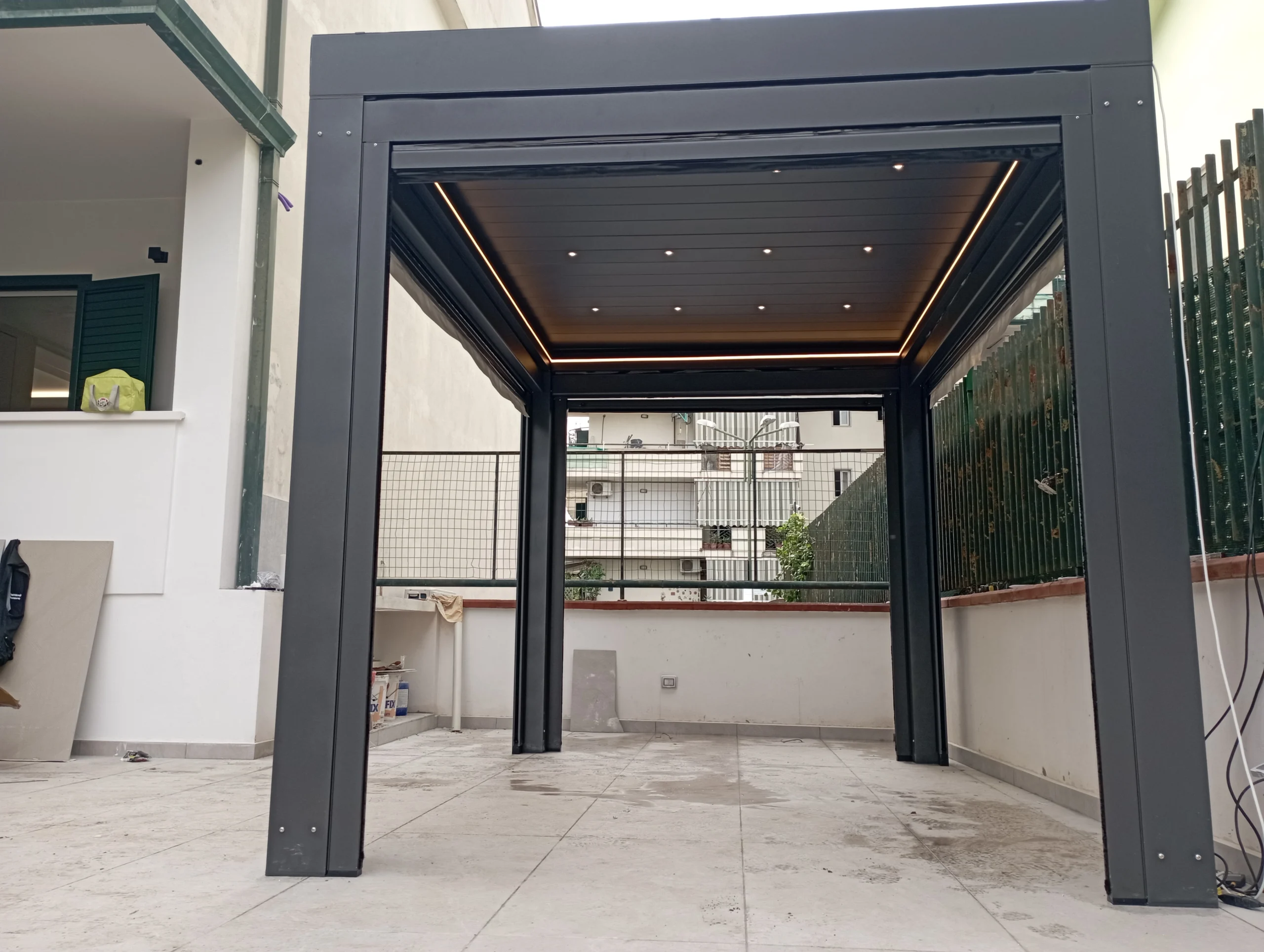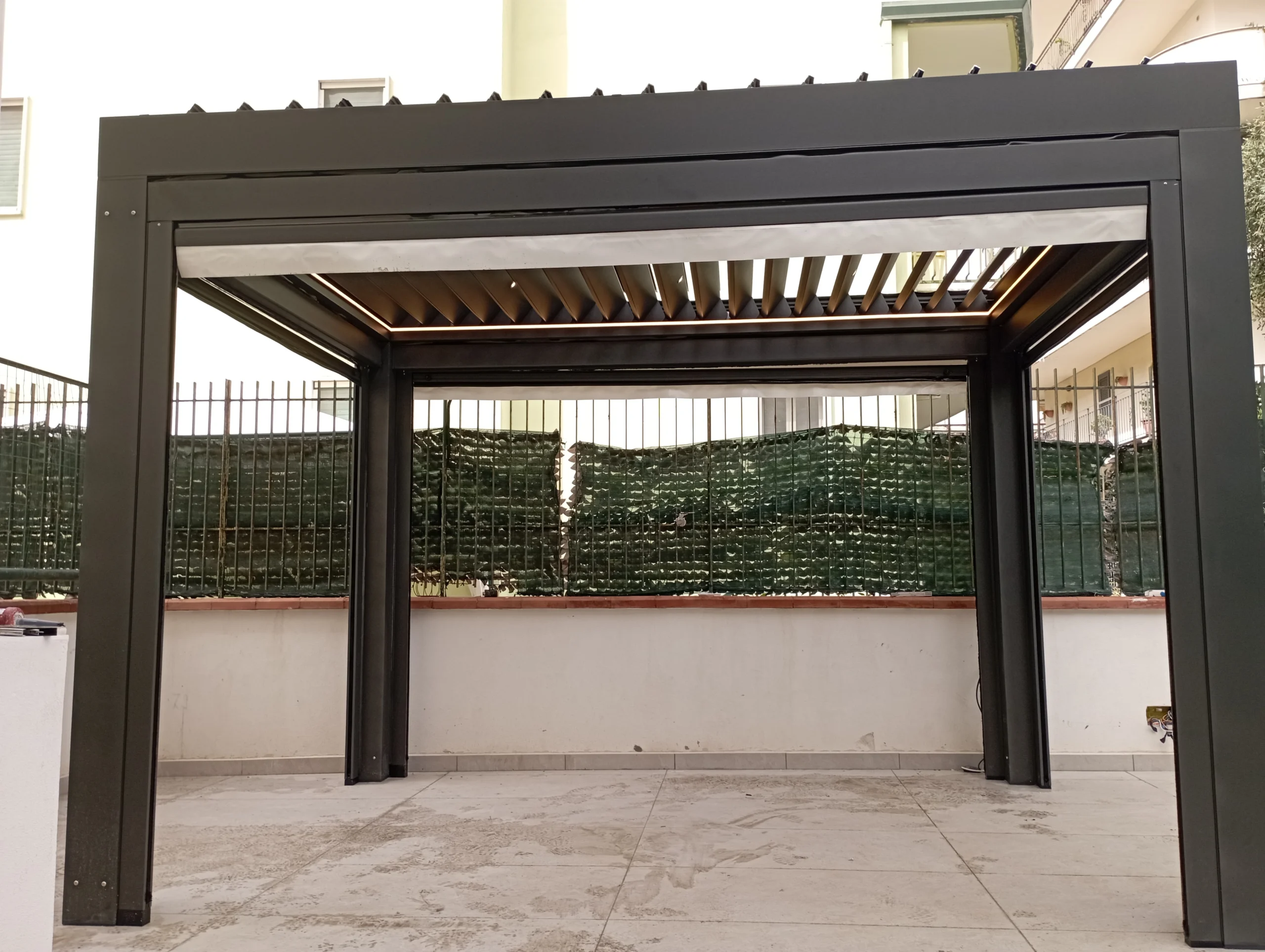 Pergola Bioclimatica con tende verticali antivento e led integrati – Acerra (NA)