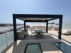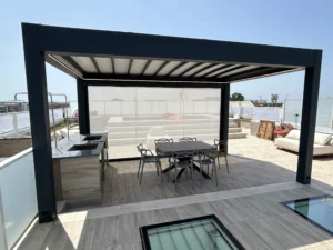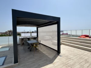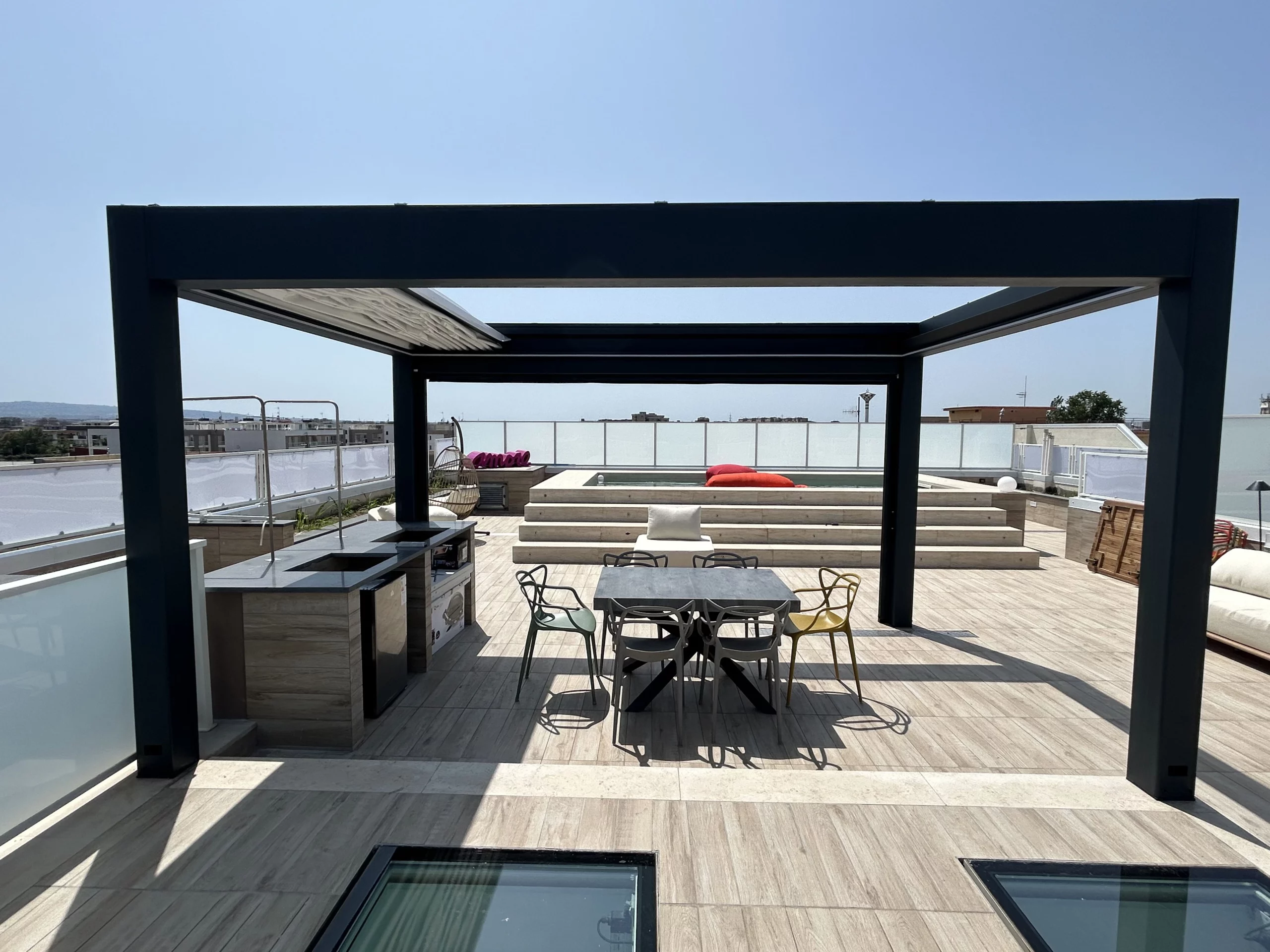 Modello: Flat Panorama (Pergola motorizzata) + Tende oscuranti (Clear zip)