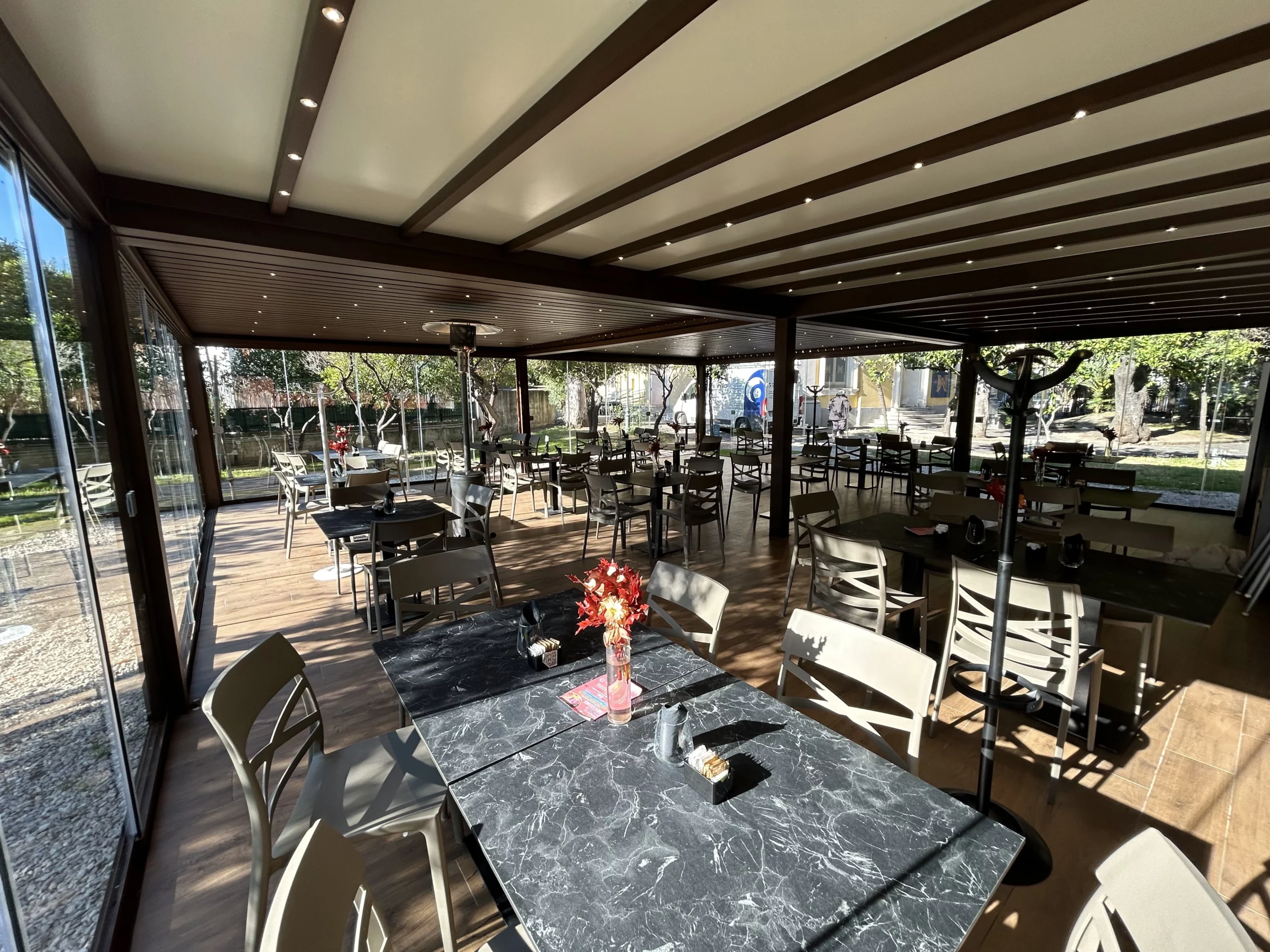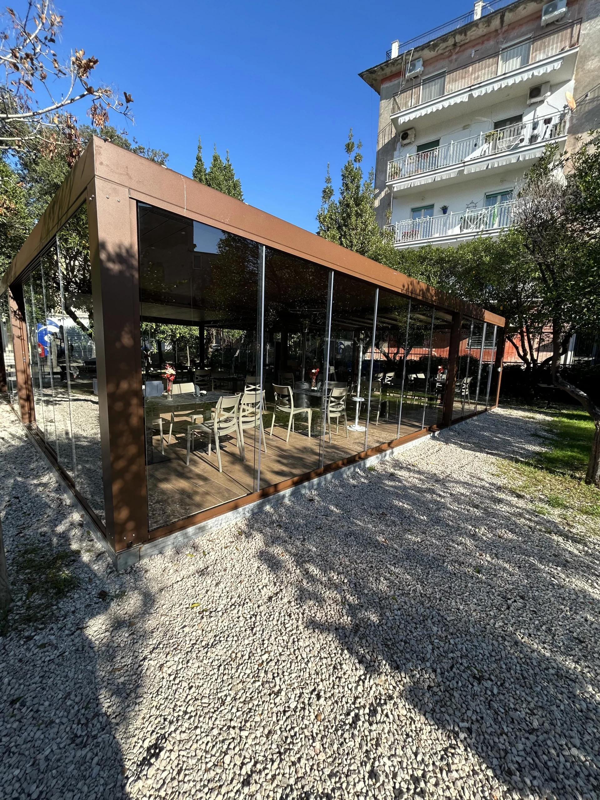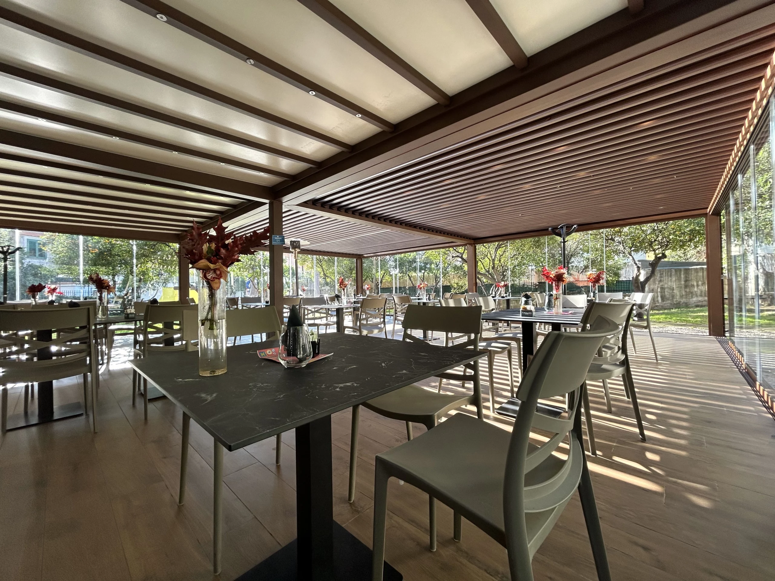 Tipologia: Copertura a telo fisso accoppiata + pergola Bioclimatica accoppiata + Vetrate scorrevoli