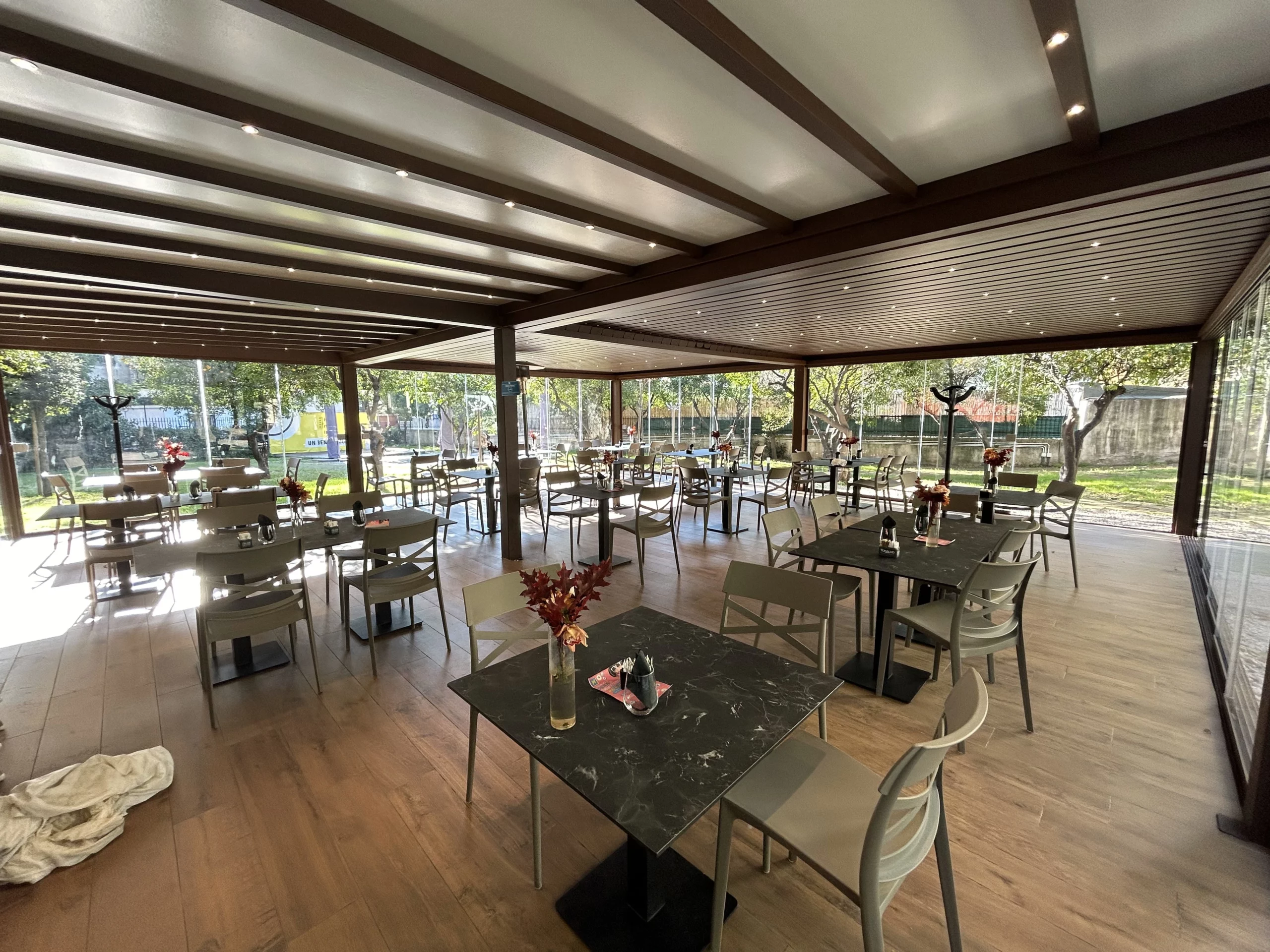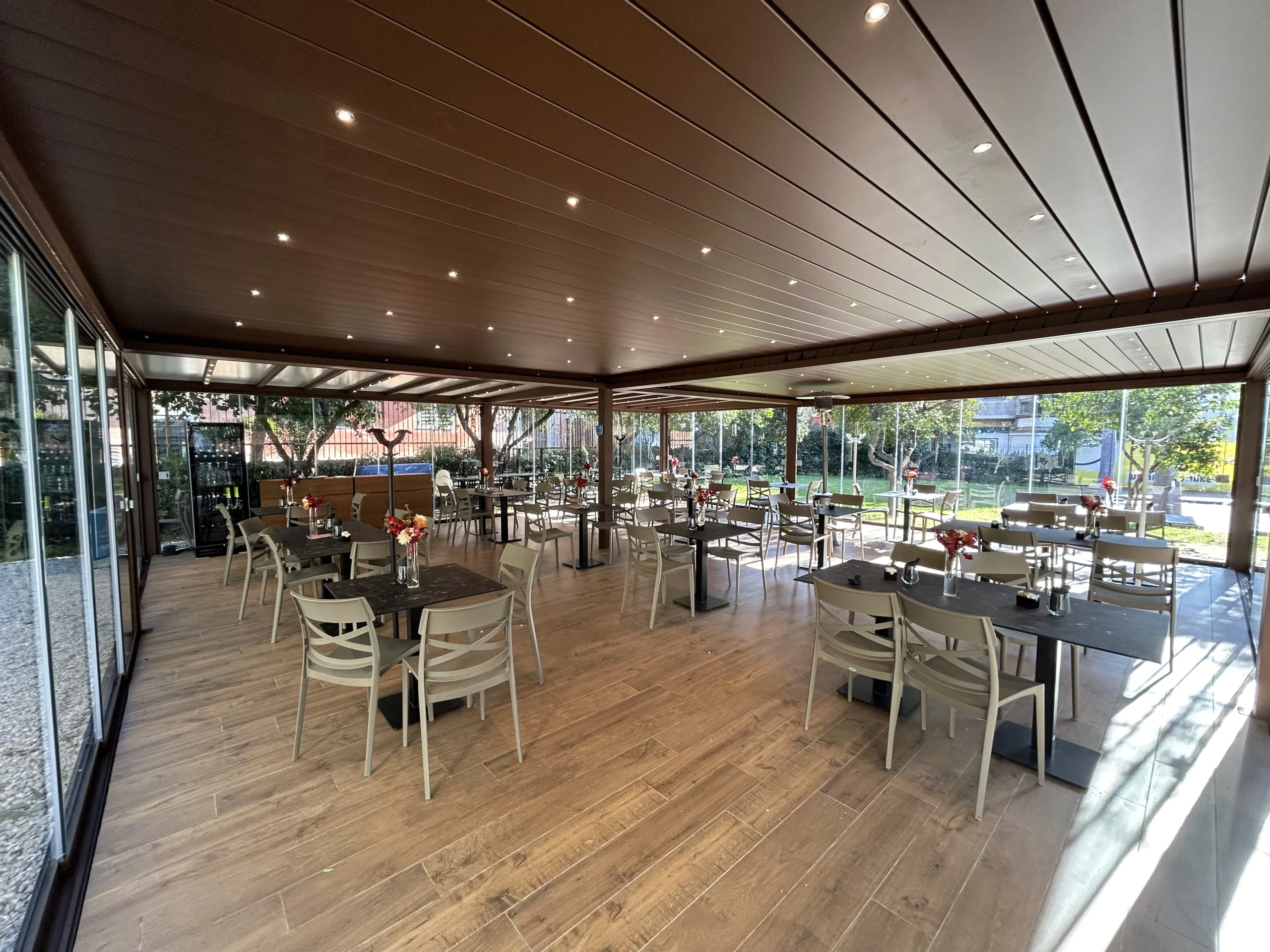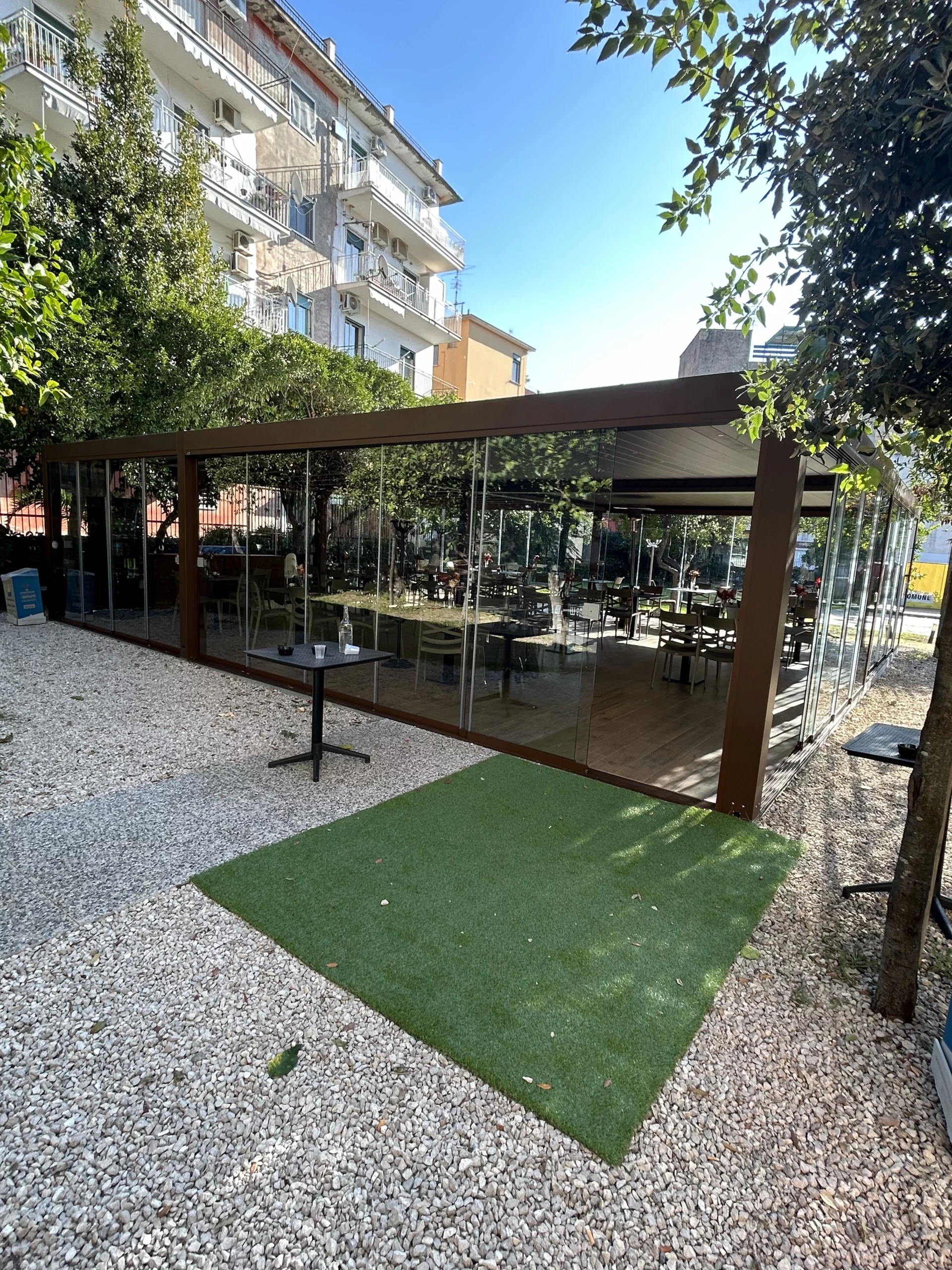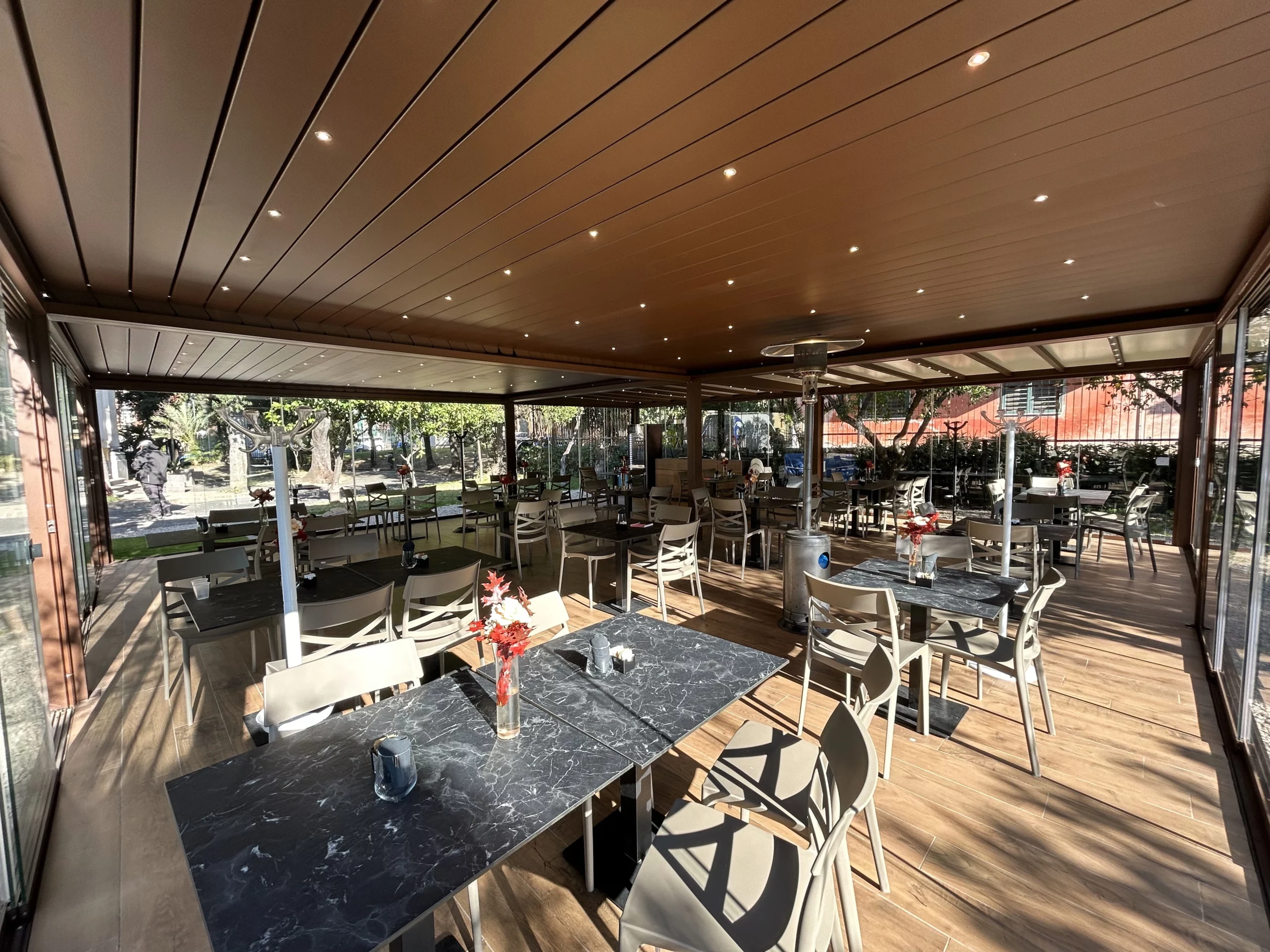Tipologia: Copertura a telo fisso accoppiata + pergola Bioclimatica accoppiata + Vetrate scorrevoli