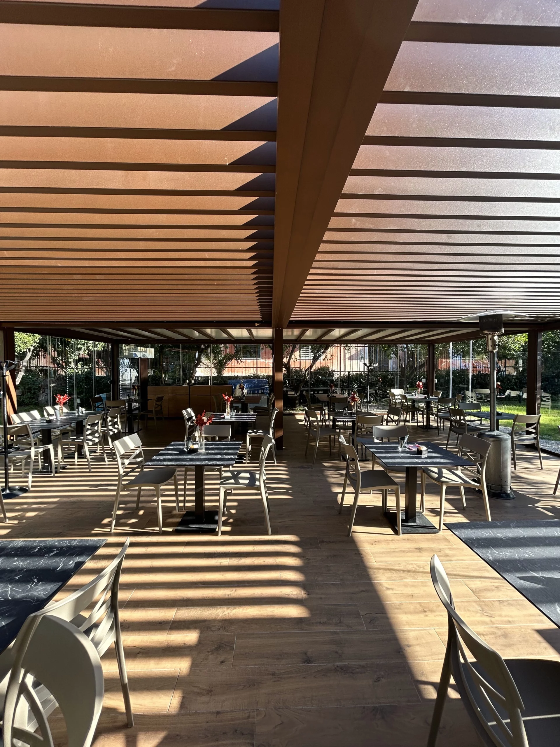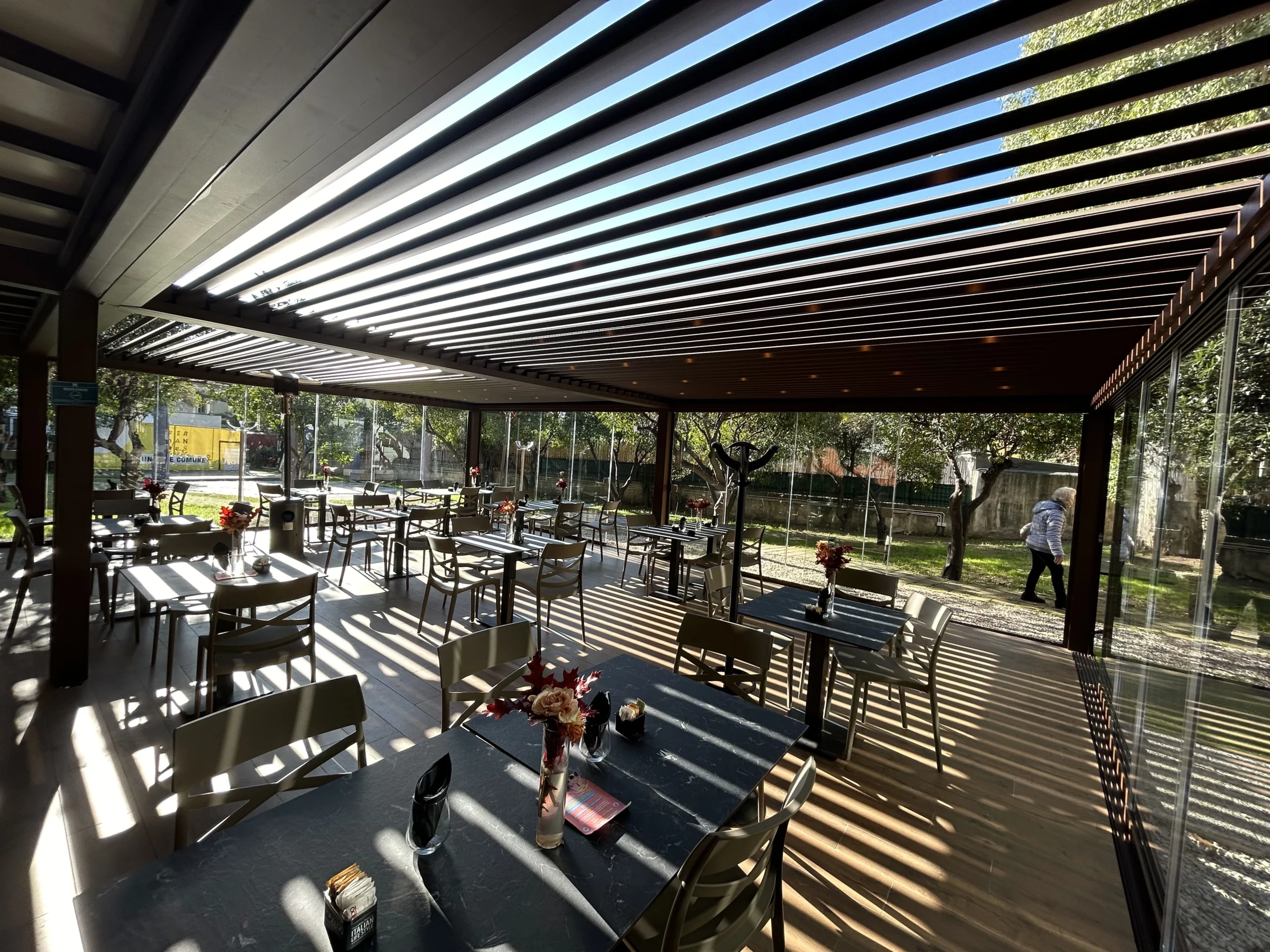Modello: Flat small (copertura a telo fisso) + pergola Bioclimatica Kirya + D-Glass (vetrate scorrevoli)