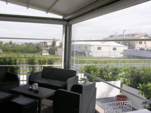 Tende con cassonetto di protezione a scorrimento verticale particolarmente indicate per la chiusura di verande, pergole e gazebo. Le guide sono corredate di spazzolini antivento all’interno delle quali scorre il telo e le barre di rinforzo in alluminio che la rendono alquanto resistente alla spinta del vento.