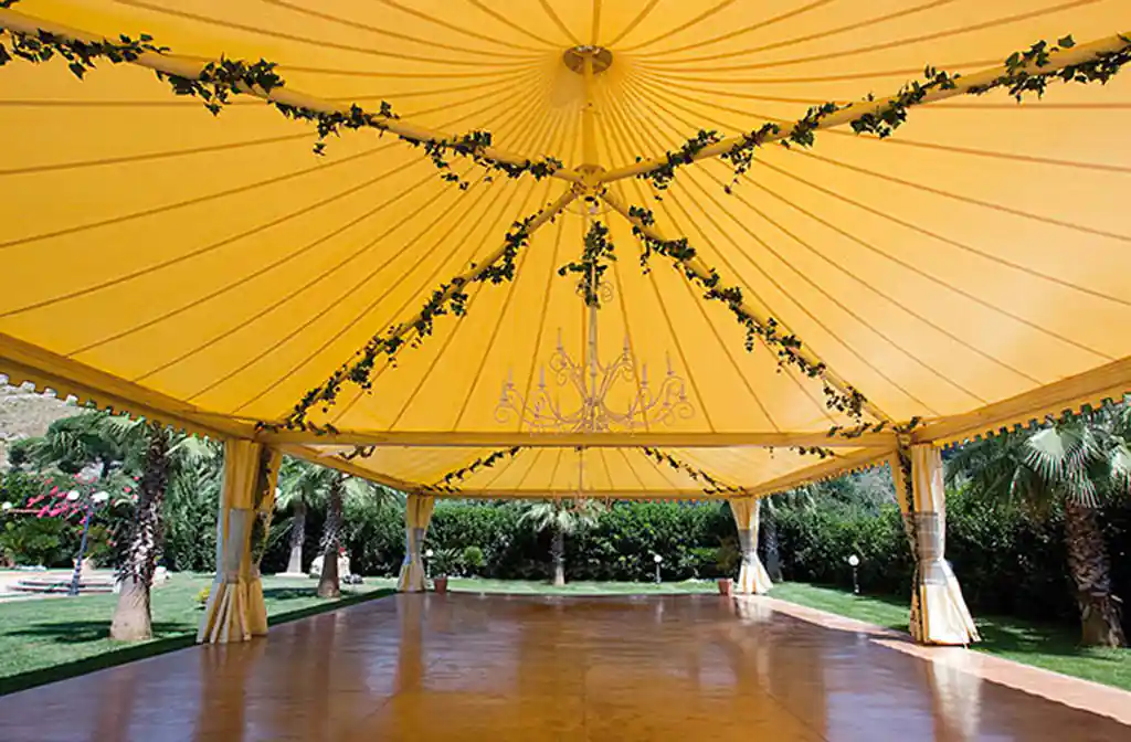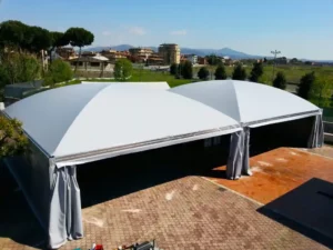 Per la nostra produzione, abbiamo scelto di realizzare i nostri Gazebo con strutture portanti in acciaio zincato e verniciato, e teli di copertura in PVC ignifugo cl.2.