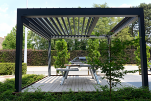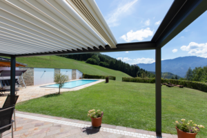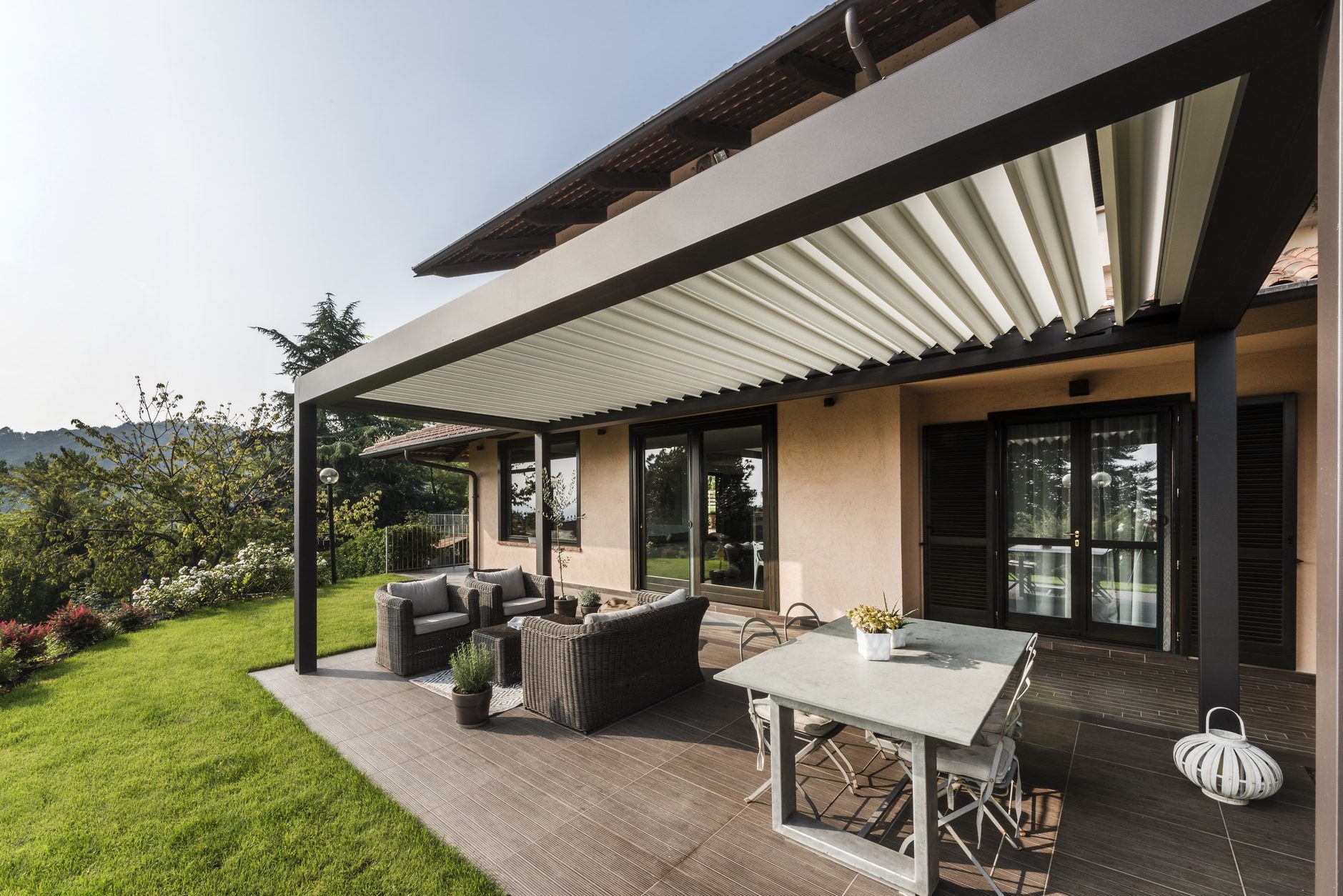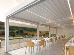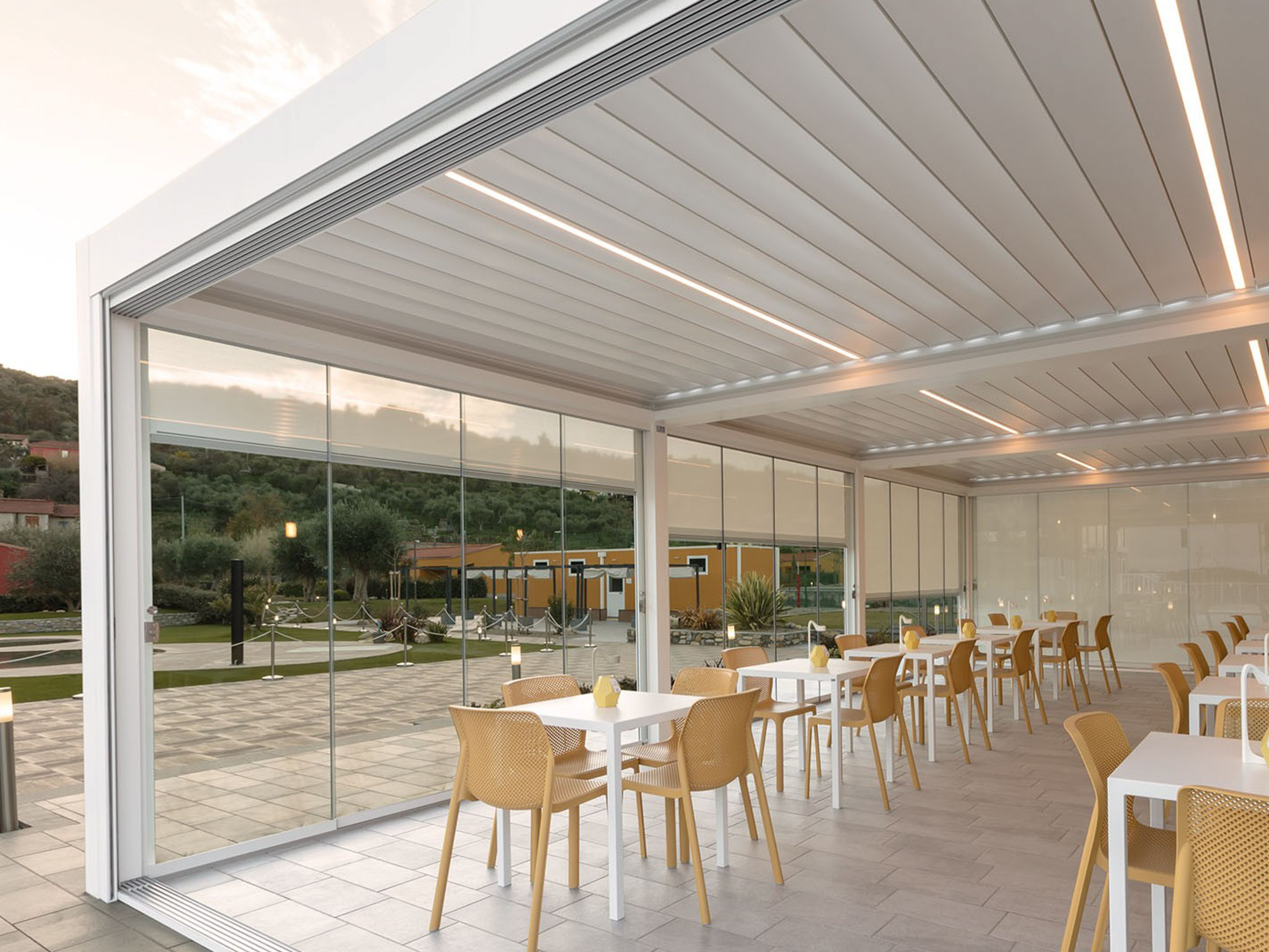 Una pergola bioclimatica consente di creare nuovi spazi da vivere all’esterno sia per le abitazioni private, sia per i locali commerciali consentendo di aumentare il numero di posti a sedere ed incrementare così il business.