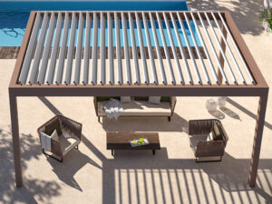 È un sistema di copertura interamente in alluminio formato da lamelle frangisole orientabili tramite l’utilizzo di un telecomando.