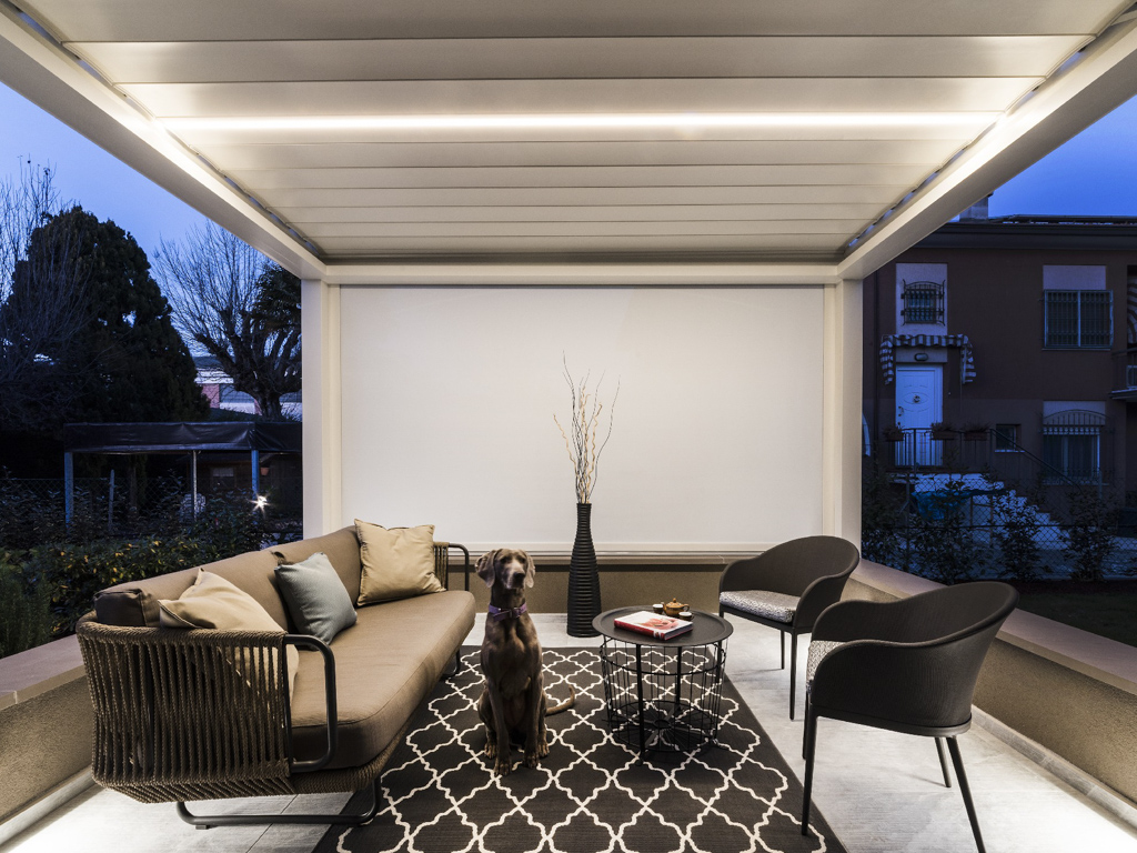 La copertura è progettata anche per riparare dalla pioggia consentendo così di ottenere uno spazio esterno open air e vivibile in ogni stagione dell’anno.