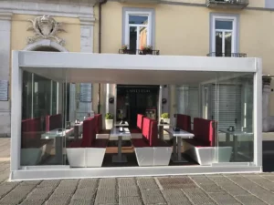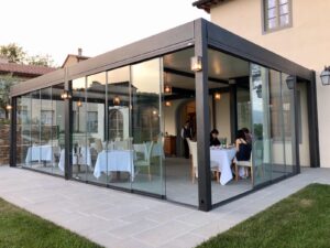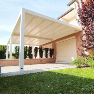 Ha una maggiore resistenza all’acqua, perché il tetto sopra è un unico elemento e l’unico limite è la dimensione delle gronde. Resta sempre una copertura rimovibile con limiti all’acqua e al vento, ma di sicuro avrà meno infiltrazioni rispetto ad una Pergola Bioclimatica o una Pergotenda. - COPERTURA DI SPAZI AMPI SENZA INGOMBRI CENTRALI