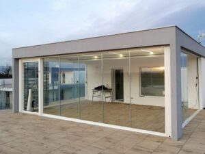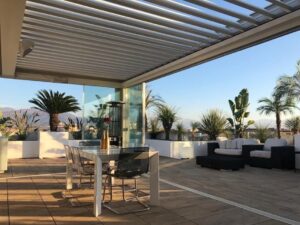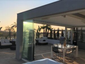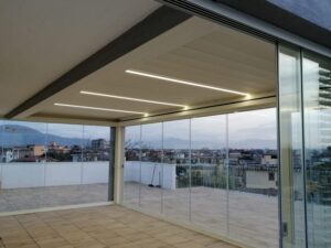 Confrontandomi con i consulenti, mi hanno consigliato una Pergola Bioclimatica Maestro di Corradi con luci LED integrate e vetrate scorrevoli sul perimetro.